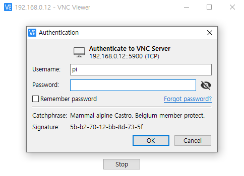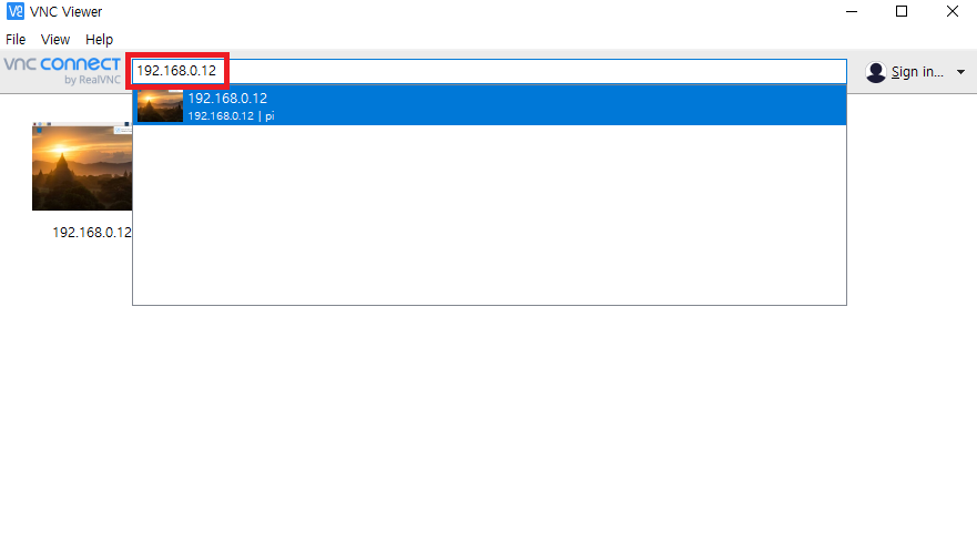 이번엔 VNC 프로그램의 상단에 라즈베리파이의 IP 주소를 입력한 후 엔터를 눌러줍니다.