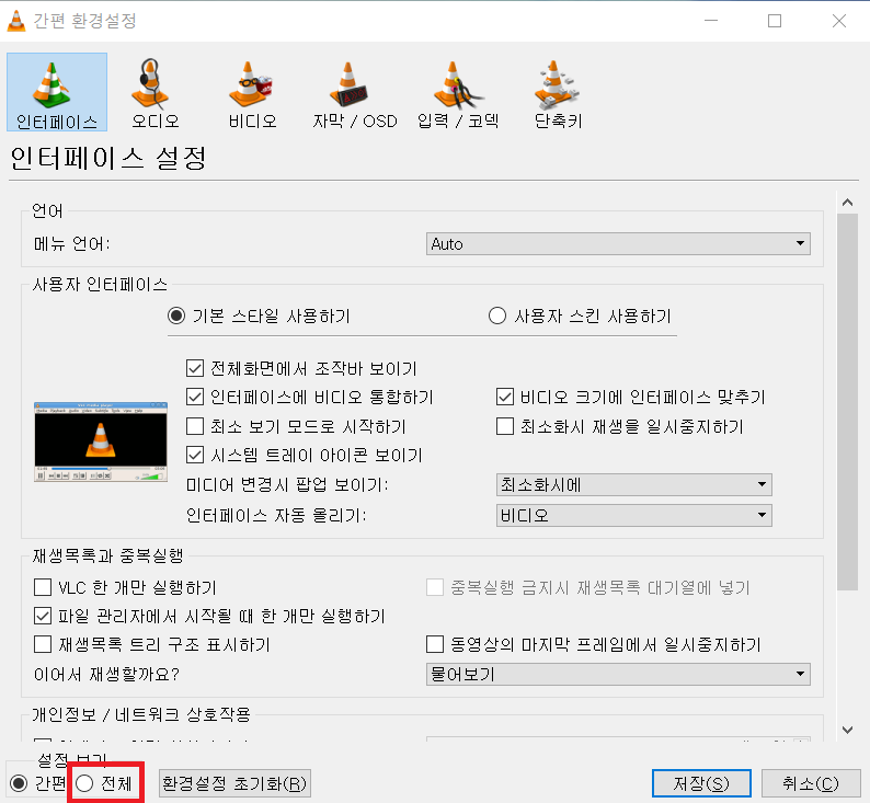 설치가 완료된후 VLC프로그램을 킨 상태에서 ctrl + p 를 눌러 환경설정을 들어가면 위와 같은 창이 뜬다.