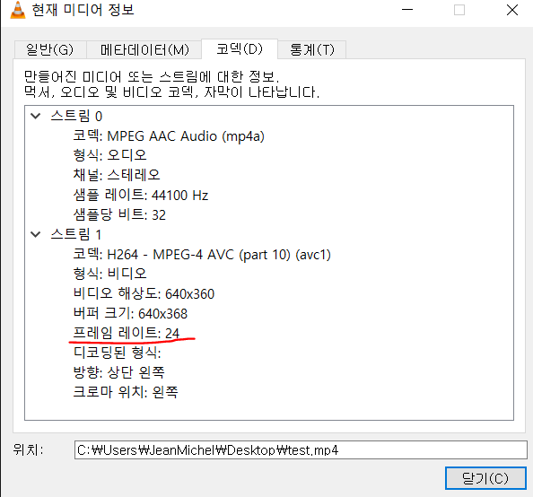 혹은 VLC로 해당 영상을 실행한 후에 ctrl+j를 눌러 확인할 수도 있다.