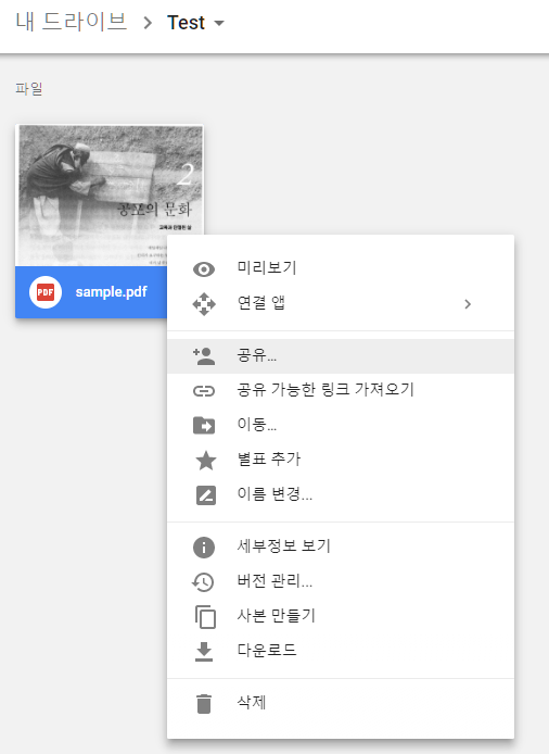 2. 올린 파일을 우클릭해서 공유 옵션으로 들어간다.