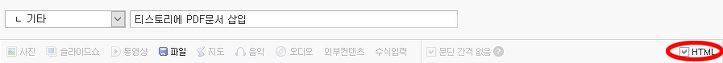 8. 티스토리에서 글을 작성할 때 메뉴 오른쪽 끝에 있는 HTML체크박스를 체크하고 위 태그를 붙여넣고 다시 체크를 헤제하면 본문에 아래처럼 PDF파일이 보인다.