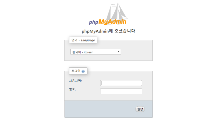 관리화면 접속 주소는 http://내부IP주소/phpmyadmin 또는 http://도메인주소/phpmyadmin입니다.
