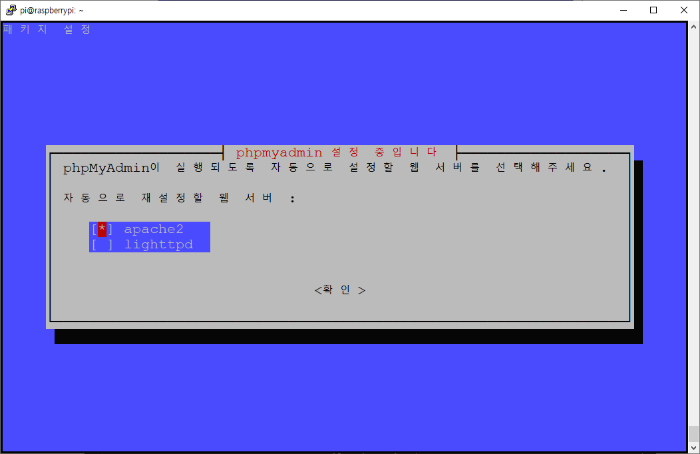 설치 중간에 다음과 같은 화면이 나오는데 apache2를 선택하면 됩니다.