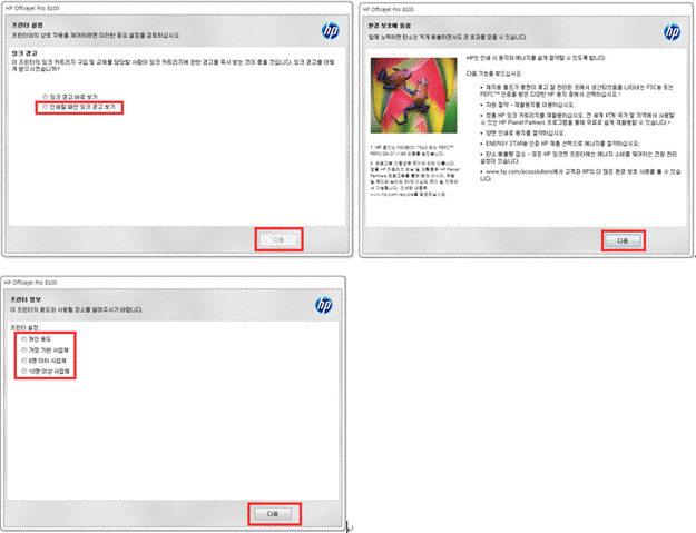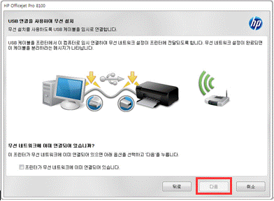 8. 해당 화면이 나오면 USB 케이블을 프린터와 컴퓨터에 연결하고 다음을 클릭합니다. (프린터가 켜져 있어야 됩니다)