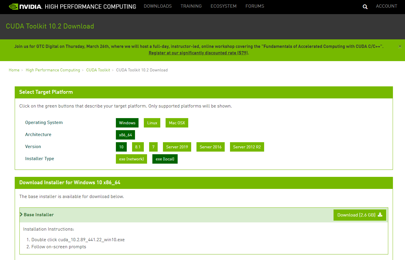 Nvidia 사이트에서 최신 Cuda Toolkit을 다운받아 설치한다(설치링크)