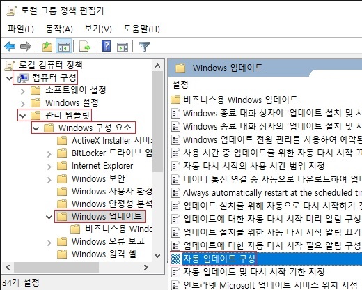 컴퓨터 구성 ☞ 관리 템플릿 ☞ windows 구성 요소 ☞ Windows 업데이트 ☞ 자동 업데이트 구성 ☞ 해제