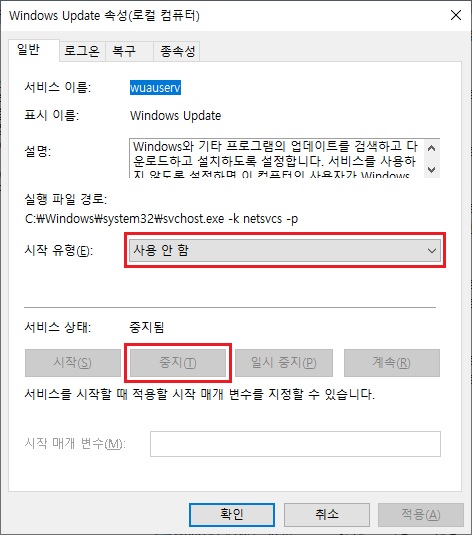 ※ 윈도우 업데이트나 마이크로소프트 스토어를 사용할 때는 시작 유형을 수동 또는 자동으로 바꾸고 서비스를 시작