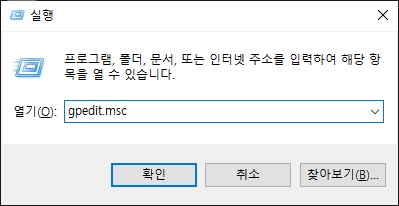 2. 실행(단축키 윈도우 + R 또는 작업표시줄 검색기) 메뉴에서 gpedit.msc 입력하여 로컬 그룹 정책 편집기 실행