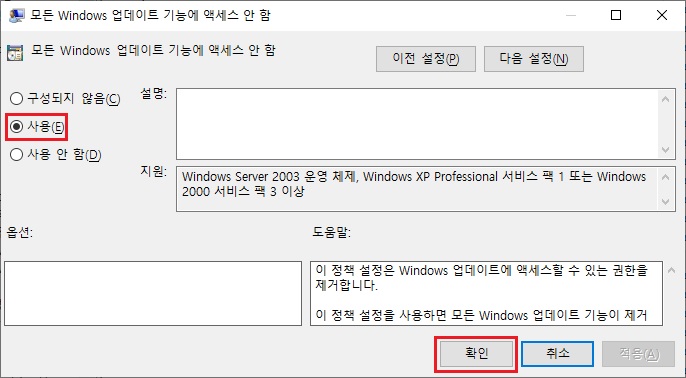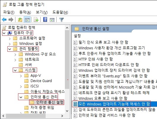 컴퓨터 구성 ☞ 관리 템플릿 ☞ 시스템 ☞ 인터넷 통신 관리 ☞ 인터넷 통신 설정 ☞ 모든 Windows 업데이트 기능에 액세스 안 함 ☞ 사용
