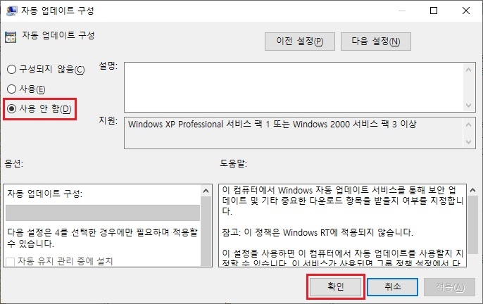 ※ 윈도우 업데이트를 사용할 때는 사용으로 변경