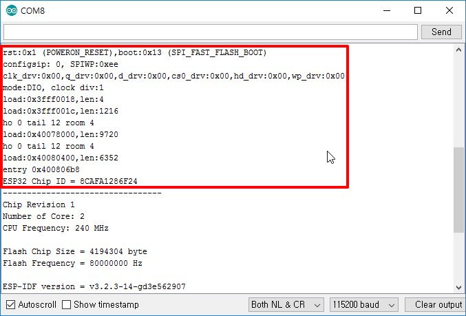 소스를 ESP32 에 처음 업로드 하면, Serial Monitor 에 정보가 표시되지 않습니다.