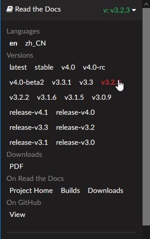화면의 왼쪽 밑부분의 버전을 클릭하면, 원하는 version 의 API 문서로 옮겨갈 수 있게 되어 있습니다.