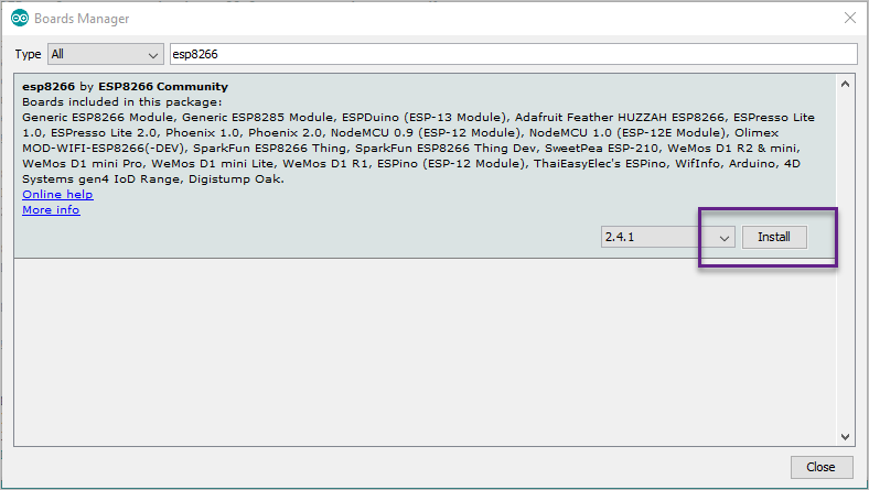 그다음, "Tools" / "Board: ..." / "Boards Manager..."를 선택하면 뜨는 대화상자에서 "esp8266"으로 검색한 항목을 선택하고 "Install" 버튼을 누릅니다.