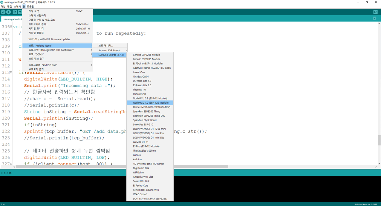 마지막으로 "Tools" / "Board: ..." 메뉴를 펼치면 이제 "NodeMCU 1.0 (ESP-12E Module)"이라는 항목이 나타납니다. 그것을 선택해 주면 설정 끝입니다.