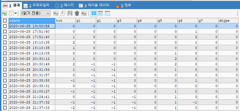 select rdate, tot, g1, g1, g3, g4, g5, g6, g7, g8 dtype from `cc_3f_test`
