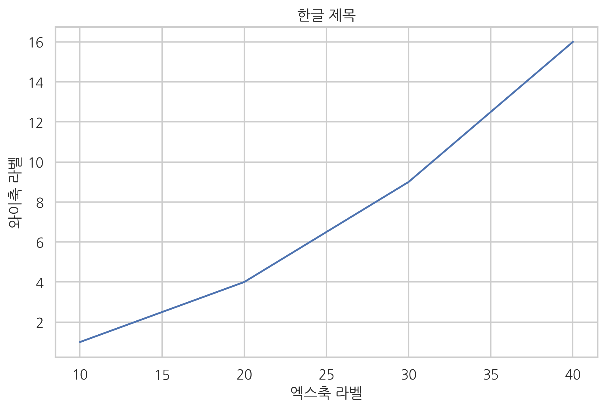 plt.title('한글 제목') plt.plot([10, 20, 30, 40], [1, 4, 9, 16]) plt.xlabel("엑스축 라벨") plt.ylabel("와이축 라벨") plt.show()