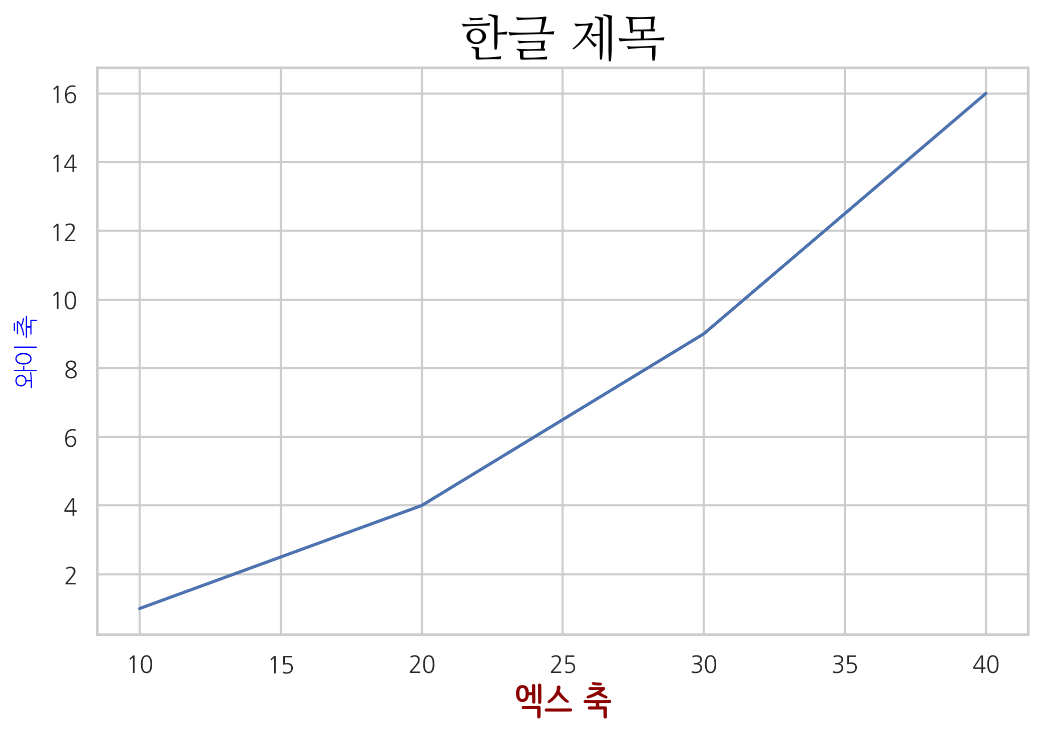 font1 = {'family': 'NanumMyeongjo', 'size': 24, 'color': 'black'} font2 = {'family': 'NanumBarunpen', 'size': 18, 'weight': 'bold', 'color': 'darkred'} font3 = {'family': 'NanumBarunGothic', 'size': 12, 'weight': 'light', 'color': 'blue'} plt.plot([10, 20, 30, 40], [1, 4, 9, 16]) plt.title('한글 제목', fontdict=font1) plt.xlabel('엑스 축', fontdict=font2) plt.ylabel('와이 축', fontdict=font3) plt.show()