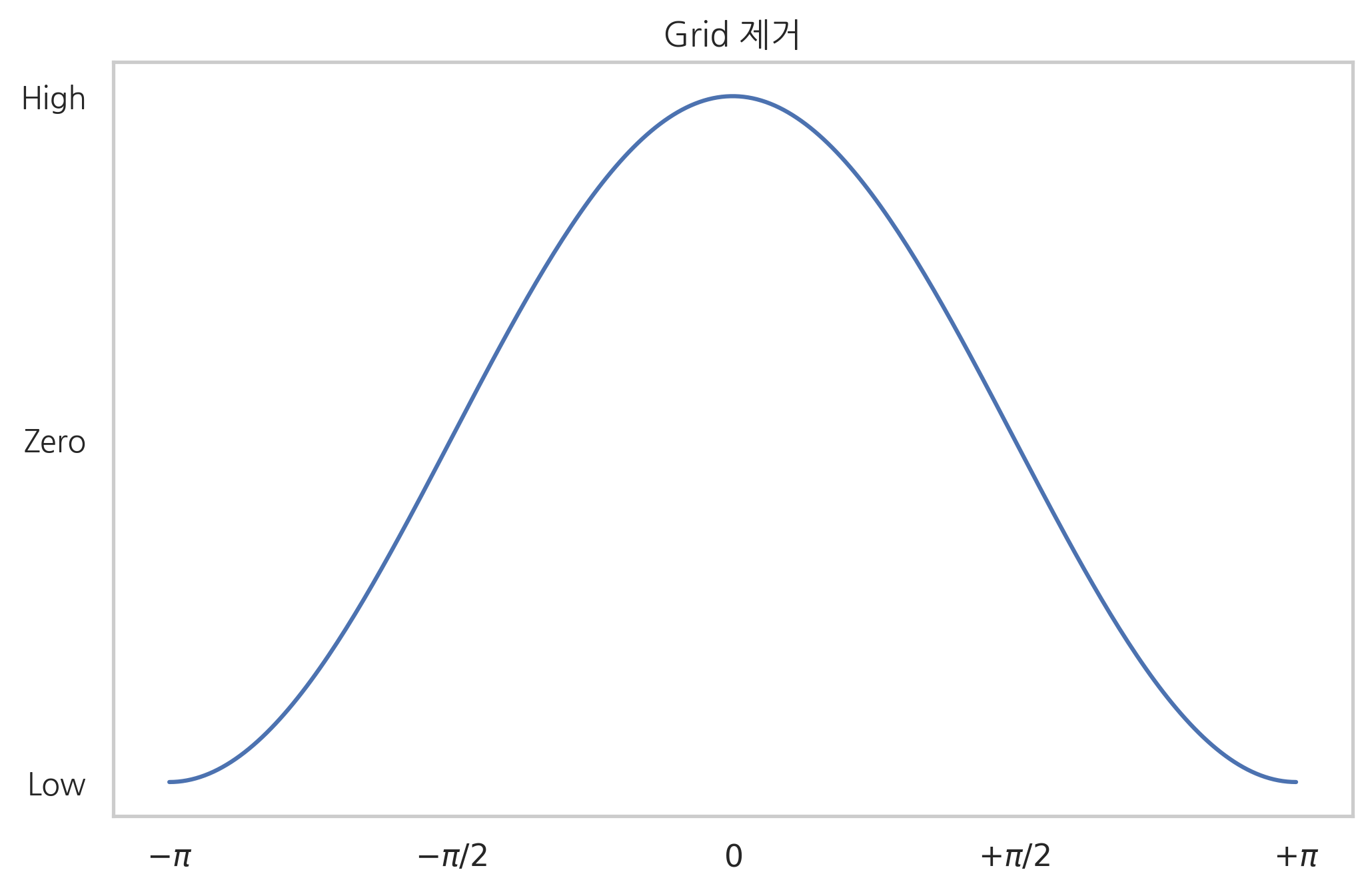 X = np.linspace(-np.pi, np.pi, 256) C = np.cos(X) plt.title("Grid 제거") plt.plot(X, C) plt.xticks([-np.pi, -np.pi / 2, 0, np.pi / 2, np.pi], [r'$-\pi$', r'$-\pi/2$', r'$0$', r'$+\pi/2$', r'$+\pi$']) plt.yticks([-1, 0, 1], ["Low", "Zero", "High"]) plt.grid(False) plt.show()