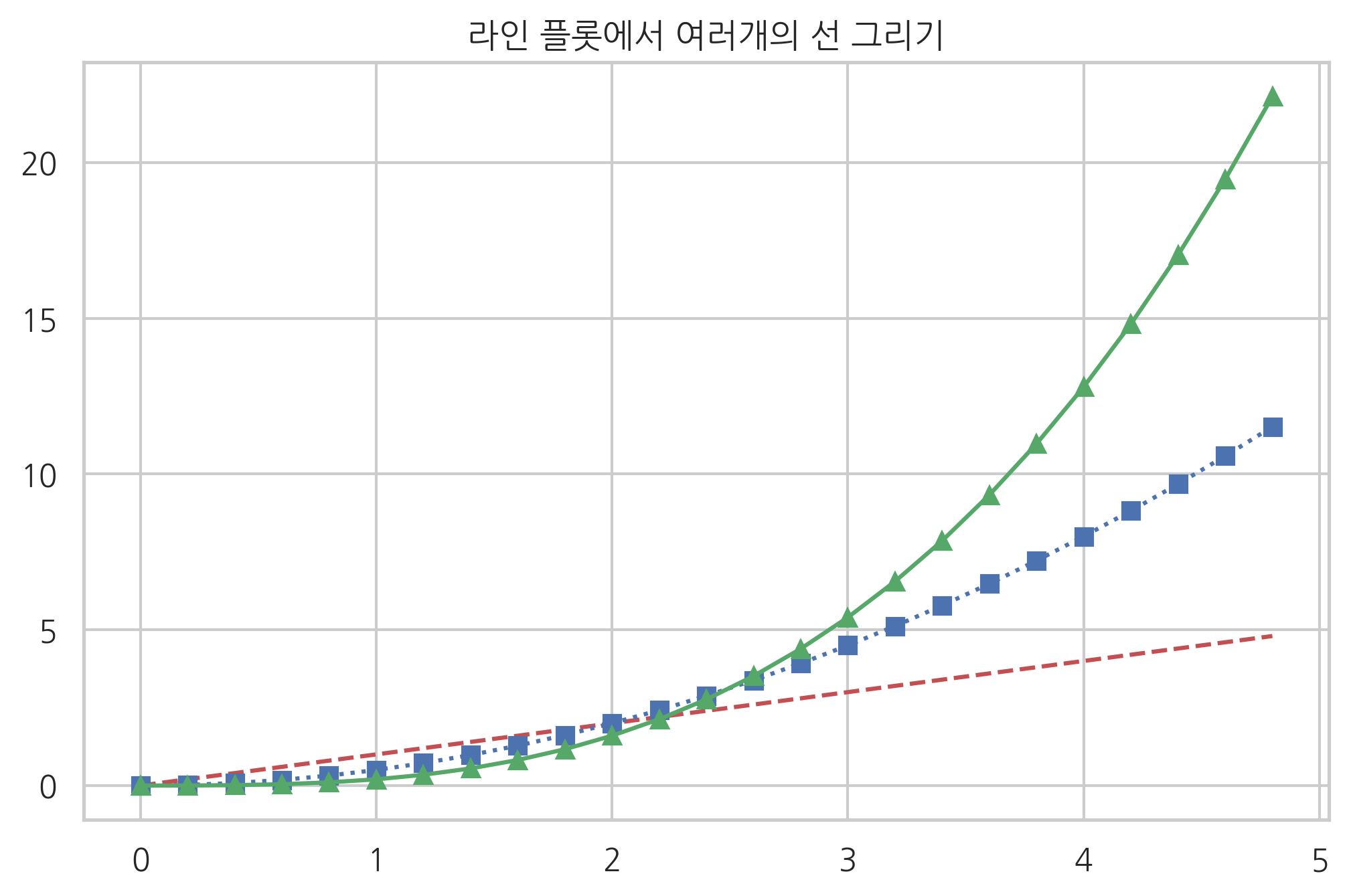 t = np.arange(0., 5., 0.2) plt.title("라인 플롯에서 여러개의 선 그리기") plt.plot(t, t, 'r--', t, 0.5 * t**2, 'bs:', t, 0.2 * t**3, 'g^-') plt.show()