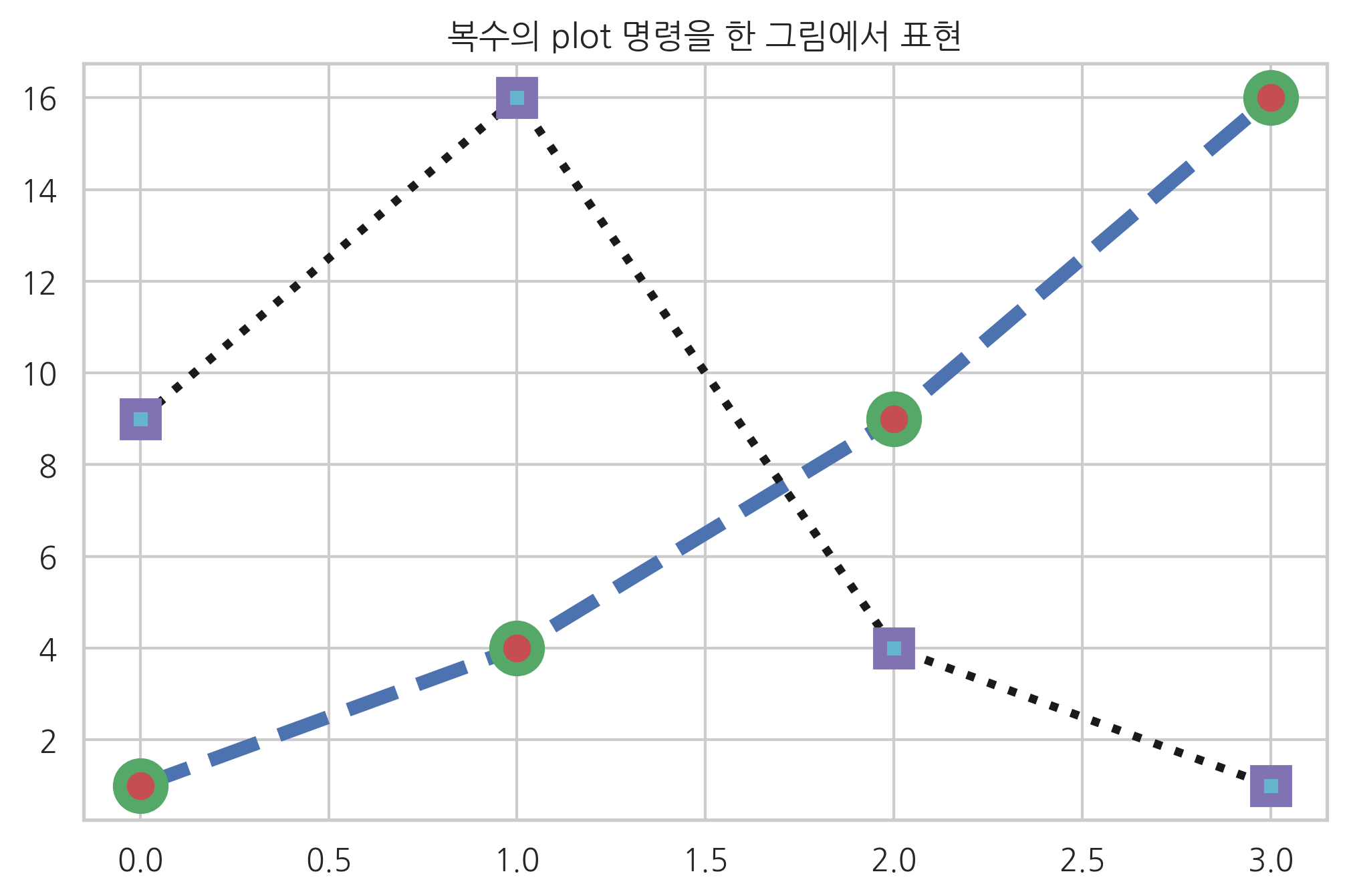 plt.title("복수의 plot 명령을 한 그림에서 표현") plt.plot([1, 4, 9, 16], c="b", lw=5, ls="--", marker="o", ms=15, mec="g", mew=5, mfc="r") # plt.hold(True) # <- 1,5 버전에서는 이 코드가 필요하다. plt.plot([9, 16, 4, 1], c="k", lw=3, ls=":", marker="s", ms=10, mec="m", mew=5, mfc="c") # plt.hold(False) # <- 1,5 버전에서는 이 코드가 필요하다. plt.show()