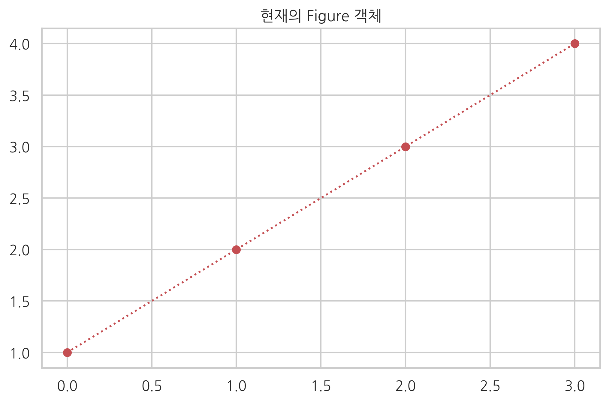f1 = plt.figure(1) plt.title("현재의 Figure 객체") plt.plot([1, 2, 3, 4], 'ro:') f2 = plt.gcf() print(f1, id(f1)) print(f2, id(f2)) plt.show()