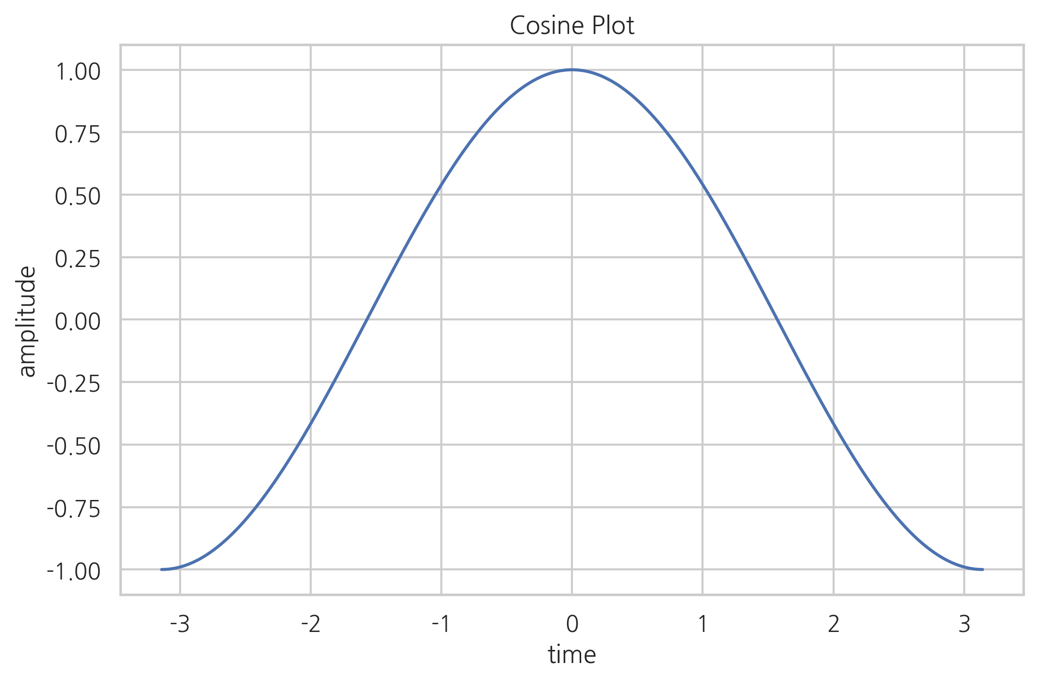 X = np.linspace(-np.pi, np.pi, 256) C, S = np.cos(X), np.sin(X) plt.plot(X, C, label="cosine") plt.xlabel("time") plt.ylabel("amplitude") plt.title("Cosine Plot") plt.show()