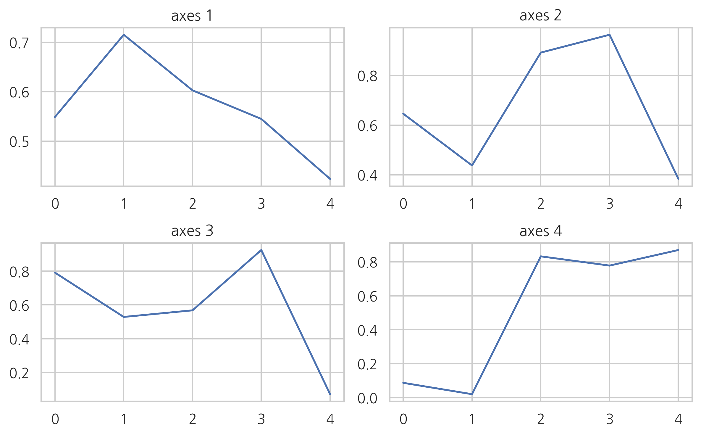 np.random.seed(0) plt.subplot(221) plt.plot(np.random.rand(5)) plt.title("axes 1") plt.subplot(222) plt.plot(np.random.rand(5)) plt.title("axes 2") plt.subplot(223) plt.plot(np.random.rand(5)) plt.title("axes 3") plt.subplot(224) plt.plot(np.random.rand(5)) plt.title("axes 4") plt.tight_layout() plt.show()