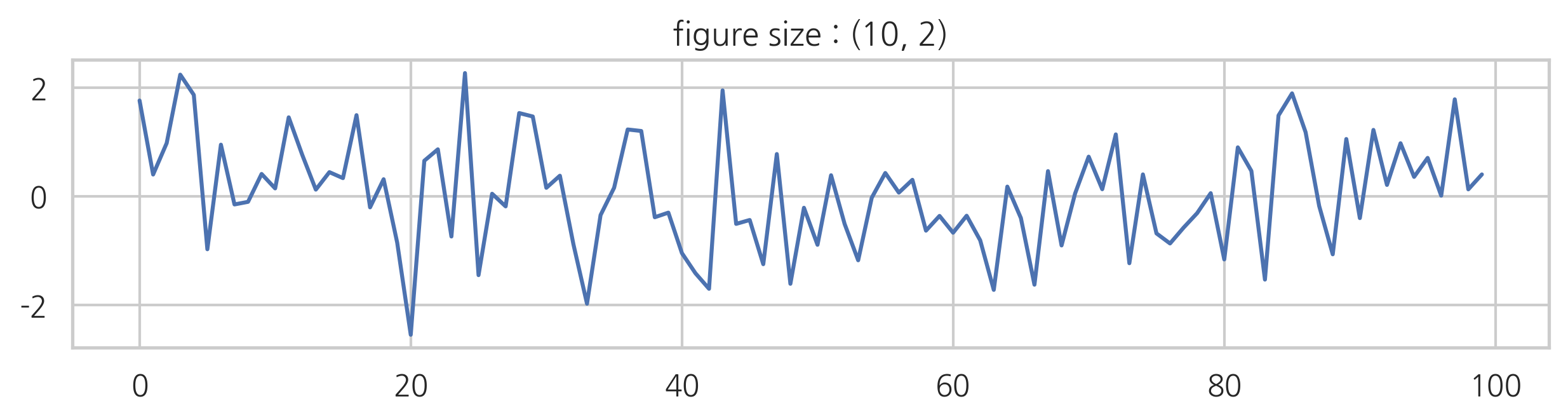 np.random.seed(0) f1 = plt.figure(figsize=(10, 2)) plt.title("figure size : (10, 2)") plt.plot(np.random.randn(100)) plt.show()