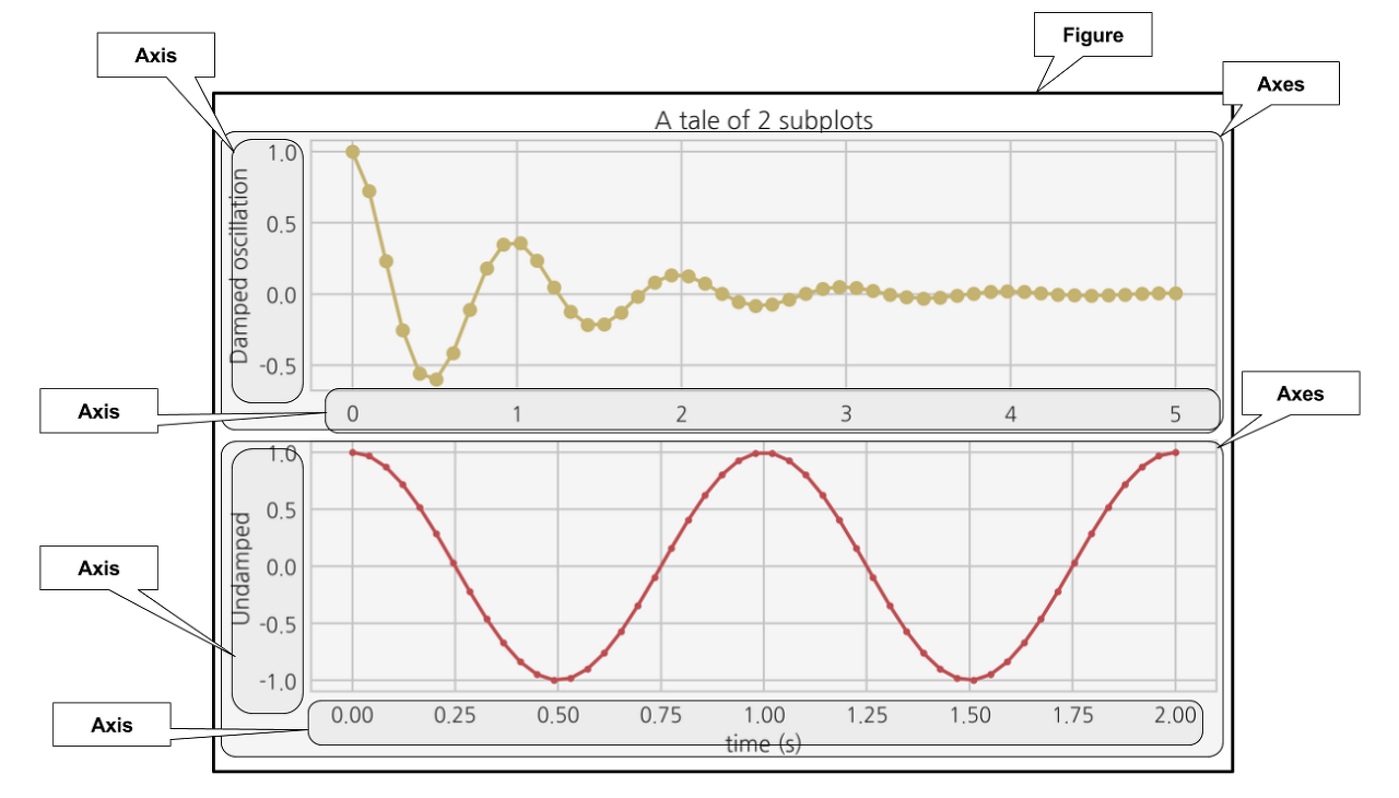 Figure는 그림이 그려지는 캔버스나 종이를 뜻하고 Axes는 하나의 플롯, 그리고 Axis는 가로축이나 세로축 등의 축을 뜻한다. Axes와 Axis의 철자에 주의한다.