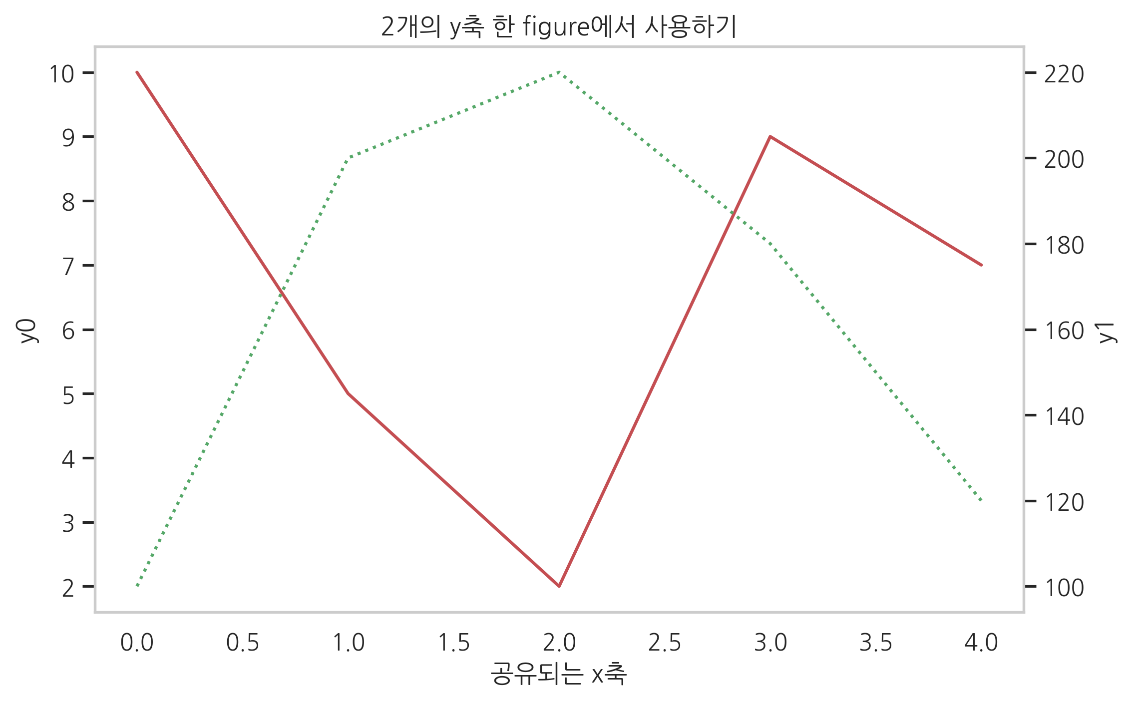 fig, ax0 = plt.subplots() ax1 = ax0.twinx() ax0.set_title("2개의 y축 한 figure에서 사용하기") ax0.plot([10, 5, 2, 9, 7], 'r-', label="y0") ax0.set_ylabel("y0") ax0.grid(False) ax1.plot([100, 200, 220, 180, 120], 'g:', label="y1") ax1.set_ylabel("y1") ax1.grid(False) ax0.set_xlabel("공유되는 x축") plt.show()