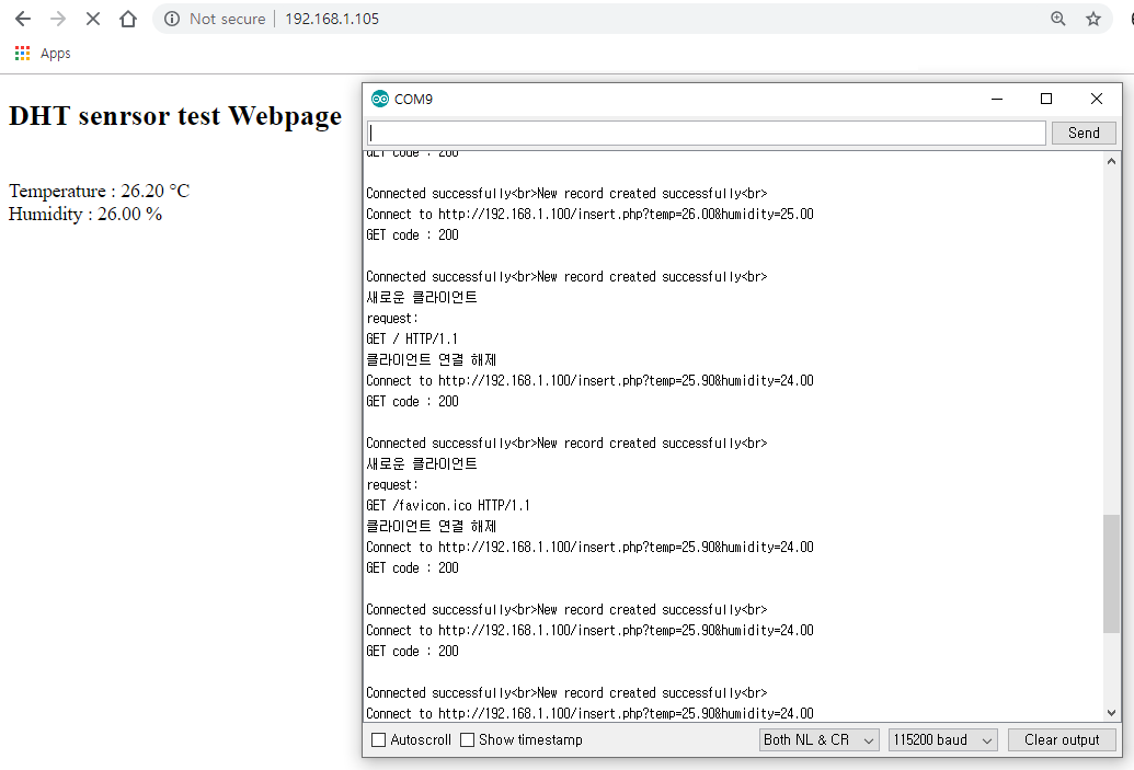웹브라우저로 온습도 값이 1초마다 바뀌며 잘 출력되는 것을 확인할 수 있으며 "http://192.168.1.100/insert.php?temp=온도값&humidity=습도값" 위 주소로 온습도값이 잘 전달되는 것도 확인할 수 있습니다. (192.168.1.100 : 필자의 라즈베리파이 IP 주소)