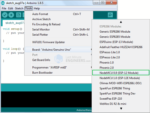 Before we get to uploading sketch & playing with LED, we need to make sure that the board is selected properly in Arduino IDE. Open Arduino IDE and select NodeMCU 0.9 (ESP-12 Module) option under your Arduino IDE > Tools > Board menu.