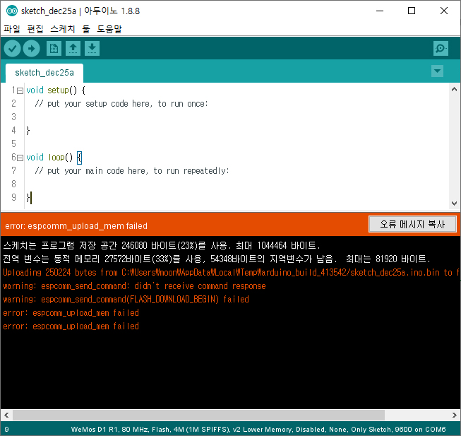 3. USB를 연결하고 다시 업로드를 실행한다.