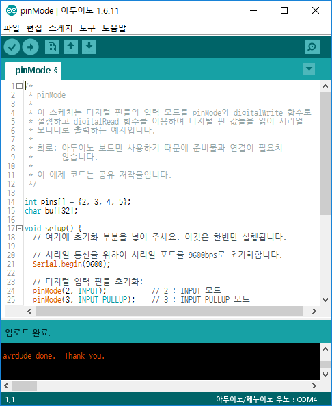 * 이 스케치는 디지털 핀들의 입력 모드를 pinMode와 digitalWrite 함수로