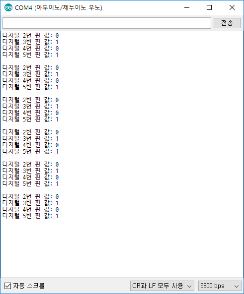 디지털 2~ 5번 핀들을 읽어 시리얼 모니터로 출력합니다.