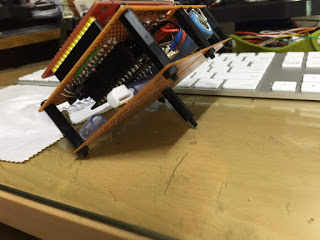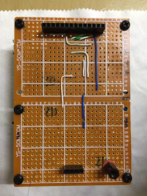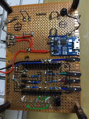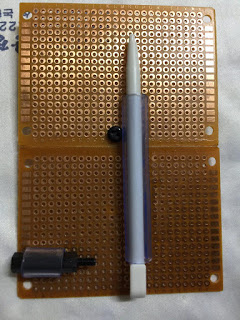 위의 그림대로 납땜을 하되, 충방전 보호 회로 + 스위치 + 배터리 홀더 정도를 붙이면 아래와 같다. 7 X 5 Cm 기판을 두장 붙여서 사용했다. 기판 두장의 서로 붙이는 면을 사포 또는 줄을 이용하여 평탄화 작업을 하고 강력 본드로 붙이면 된다. 물론 강력 본드로 붙이는 만큼 충격에 약하다. 취중 납땜이라 그닥 안이쁘다. ㅠㅠ.