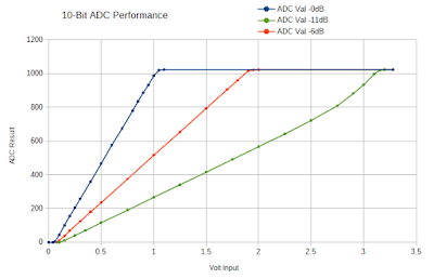 12비트로 데이터를 읽으면 완벽하게 선형에 가깝지 않고 살짝 노이즈가 들어간다는 느낌이 들기 때문에 선형에 근사시키기 위하여 10비트로 데이터를 읽으며, 아래의 표를 참조하면 측정시 6db로 읽으면 가장 유리하다는 것을 알 수 있다.