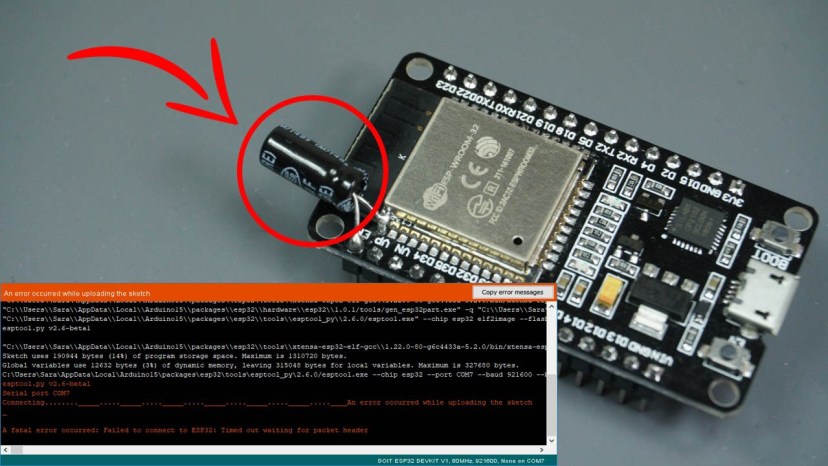 Learn how to fix the Fatal Error Occurred: “Failed to connect to ESP32: Timed out waiting for packet header” error when trying to upload new code to your ESP32 board once for all.