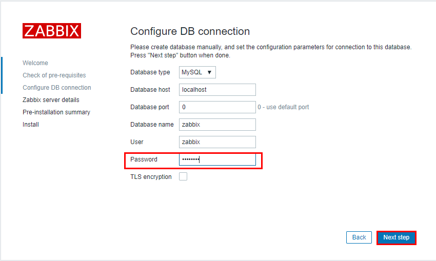 기본 zabbix DB 입력 password 입력하라고 나오는데 위 password 입력