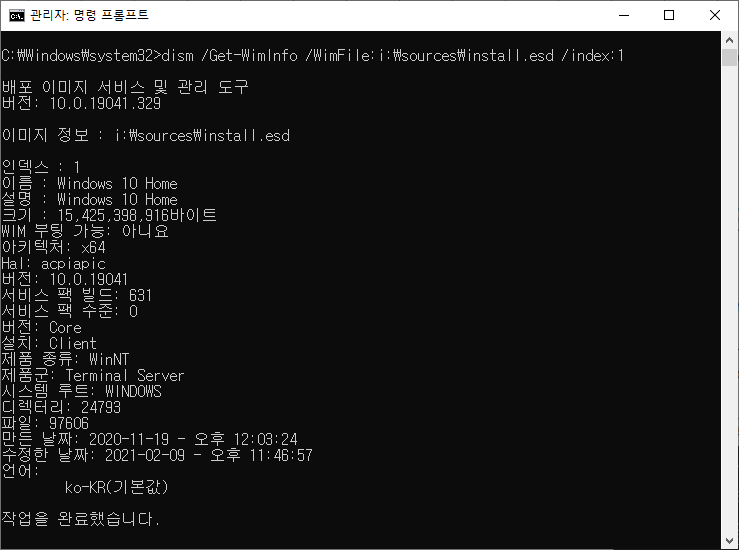 위 명령어를 입력하면 ISO 파일의 에디션 버전과 빌드등의 정보를 확인할 수 있습니다.