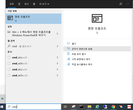 Windows 검색에서 cmd를 입력해 명령 프롬프트를 찾은 다음 마우스 오른쪽 버튼을 클릭해서 관리자 권한으로 실행합니다.