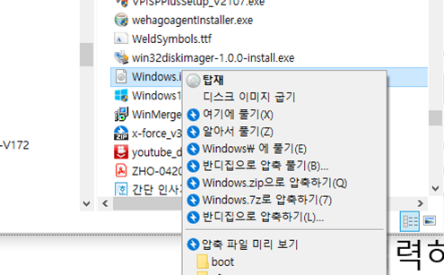 윈도우10 ISO 파일을 마우스 오른쪽 버튼으로 클릭한 다음 ‘탑재’를 클릭해 ISO 파일을 마운트 합니다.