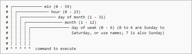 위 그림처럼 분, 시, 일, 월, 요일, 명령 순서로 기재하면 됩니다.