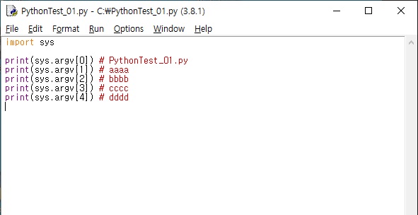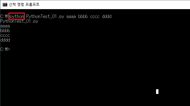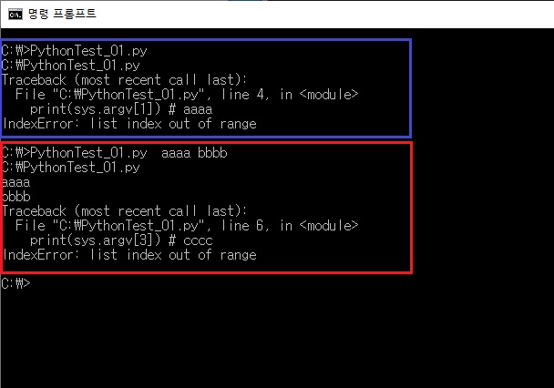 항상 매개변수의 인덱스 [0]은 파이썬 파일명임을 잊지 마시기 바랍니다. (리눅스 실행파라미터와 똑같습니다.)