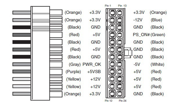 | 24(20+4) pin 메인 커넥터 | 메인보드에 연결 | 20pin ATX 1.x, 24pin ATX 2.x (PCI-E 슬롯에 추가 전원공급을 위해 4핀 추가) |