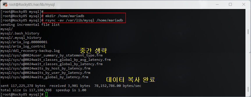 [root@Rocky85 /]# rsync -av /var/lib/mysql /home/mariadb