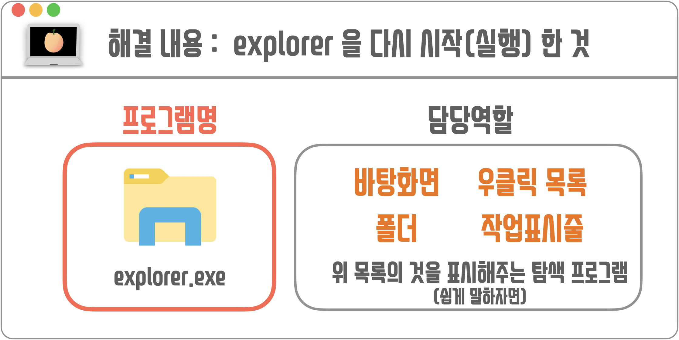 따라서 이 프로그램에 문제가 생기면 멈추거나, 종료되면 모든 폴더가 꺼지고 바탕화면, 작업표시줄이 사라지는 것이죠.