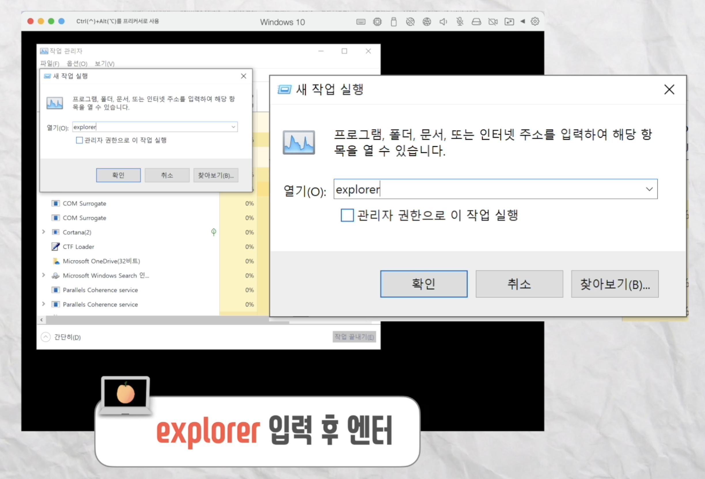 explorer.exe는 바탕화면, 작업표시줄, 창을 관리하는프로그램으로 우리가 사용하는 폴더내용, 오른쪽 클릭할 때 나오는 목록(새폴더, 삭제 등) 등을 보여주는 프로그램이라고 생각하시면 됩니다.