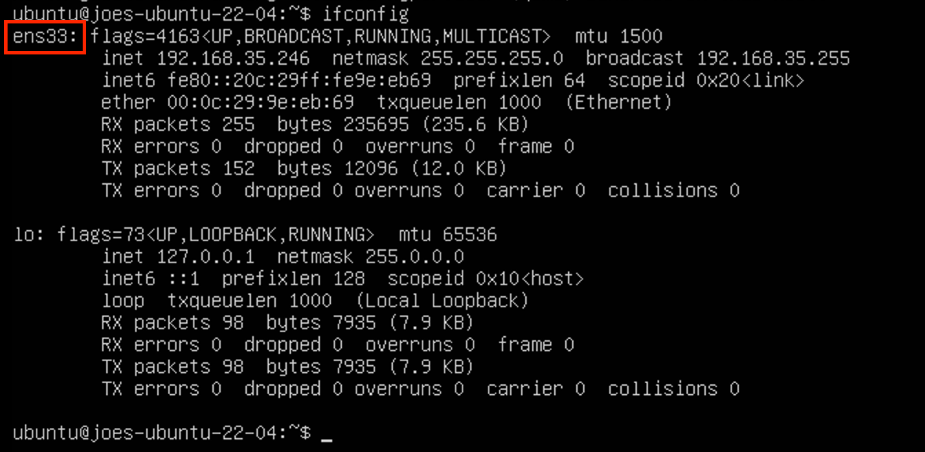 1. Ubuntu 22.04 LTS Terminal에서 아이피 주소 변경하기 1) 인터페이스 정보 확인 "ifconfig"명령어로 인터페이스 이름 확인 2) netplan 설정 파일 변경 "vim /etc/netplan/00-installer-config.yaml" 명령 실행하여 netplan