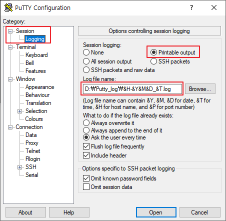 Putty에서 Session - Logging 메뉴에서 "Printable output" 을 체크하고 파일명은 아래와 같이 한다. "&H-&Y&M&D_&T.log" 이렇게 하면 지정된 폴더에 접속한 호스트 명과 접속한 날짜 시간 파일명으로 로그 파일이